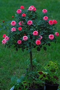 Queste tipologie di rose vengono riprodotte in vivaio innestando su astoni di rose selvatiche alcune varietà arbustive (rosa ad alberello) oppure sarmentose rambler (rose piangenti).